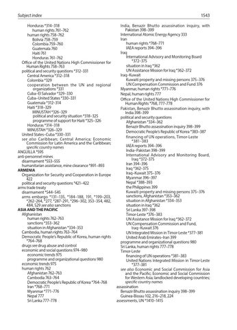 Subject index Honduras *314–318 human rights 761–762 human rights 758–762 Bolivia 758–759 Colombia 759–760 Guatemala 760 Haiti 761 Honduras 761–762 Office of the United Nations High Commissioner for Human Rights 758–763 political and security questions *312–331 Central America *312–318 Colombia *329 cooperation between the UN and regional organizations *331 Cuba–El Salvador *329–330 Cuba–United States *330–331 Guatemala *312–314 Haiti *318–329 MINUSTAH *326–329 political and security situation *318–325 programme of support for Haiti *325–326 Honduras *314–318 MINUSTAH *326–329 United States–Cuba *330–331 see also Caribbean; Central America; Economic Commission for Latin America and the Caribbean; specific country names ANGUILLA *595 anti-personnel mines disarmament *553–555 humanitarian assistance, mine clearance *891–893 ARMENIA Organization for Security and Cooperation in Europe 422 political and security questions *421–422 arms trade treaty disarmament *544–545 arms embargo *131–135, *184–188, 191, *199–203, *262–264, *277, *287–291, *296–302, 353–354, 482, 484, 529 see also sanctions ASIA AND THE PACIFIC Afghanistan human rights 762–763 sanctions *353–362 situation in Afghanistan *334–353 Cambodia, human rights 763–764 Democratic People’s Republic of Korea, human rights *764–768 drugs see drug abuse and control economic and social questions 974–980 economic trends 975 programme and organizational questions 980 economic trends 975 human rights 762 Afghanistan 762–763 Cambodia 763–764 Democratic People’s Republic of Korea *764–768 Iran *768–771 Myanmar *771–776 Nepal 777 Sri Lanka 777–778