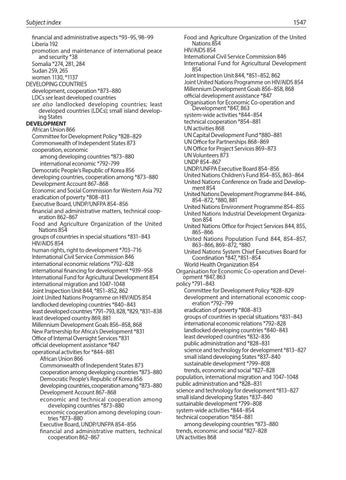 Subject index financial and administrative aspects *93–95, 98–99 Liberia 192 promotion and maintenance of international peace and security *38 Somalia *274, 281, 284 Sudan 259, 265 women 1130, *1137 DEVELOPING COUNTRIES development, cooperation *873–880 LDCs see least developed countries see also landlocked developing countries; least developed countries (LDCs); small island developing States DEVELOPMENT African Union 866 Committee for Development Policy *828–829 Commonwealth of Independent States 873 cooperation, economic among developing countries *873–880 international economic *792–799 Democratic People’s Republic of Korea 856 developing countries, cooperation among *873–880 Development Account 867–868 Economic and Social Commission for Western Asia 792 eradication of poverty *808–813 Executive Board, UNDP/UNFPA 854–856 financial and administrative matters, technical cooperation 862–867 Food and Agriculture Organization of the United Nations 854 groups of countries in special situations *831–843 HIV/AIDS 854 human rights, right to development *703–716 International Civil Service Commission 846 international economic relations *792–828 international financing for development *939–958 International Fund for Agricultural Development 854 international migration and 1047–1048 Joint Inspection Unit 844, *851–852, 862 Joint United Nations Programme on HIV/AIDS 854 landlocked developing countries *840–843 least developed countries *791–793, 828, *829, *831–838 least developed country 869, 881 Millennium Development Goals 856–858, 868 New Partnership for Africa’s Development *831 Office of Internal Oversight Services *831 official development assistance *847 operational activities for *844–881 African Union 866 Commonwealth of Independent States 873 cooperation among developing countries *873–880 Democratic People’s Republic of Korea 856 developing countries, cooperation among *873–880 Development Account 867–868 economic and technical cooperation among developing countries *873–880 economic cooperation among developing countries *873–880 Executive Board, UNDP/UNFPA 854–856 financial and administrative matters, technical cooperation 862–867