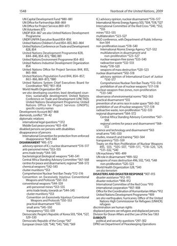 1548 UN Capital Development Fund *880–881 UN Office for Partnerships 868–869 UN Office for Project Services 869–873 UN Volunteers 873 UNDP 854–867 see also United Nations Development Programme UNDP/UNFPA Executive Board 854–856 United Nations Children’s Fund 854–855, 863–864 United Nations Conference on Trade and Development 828, 854 United Nations Development Programme 828, 844–846, 854–872, *880, 881 United Nations Environment Programme 854–855 United Nations Industrial Development Organization 854 United Nations Office for Project Services 844, 855, 865–866 United Nations Population Fund 844, 854–857, 863–866, 869–872, *880 United Nations System Chief Executives Board for Coordination *847, *851–854 World Health Organization 854 see also developing countries; least developed countries; sustainable development; United Nations Conference on Trade and Development (UNCTAD); United Nations Development Programme; United Nations Office for Project Services (UNOPS); specific country names Development Account 867–868 diamonds, conflict *39–42 diplomatic relations international legal questions *1312 Middle East peace process *433–434 disabled persons see persons with disabilities disappearance of persons International Convention for protection from enforced disappearance *643–644 DISARMAMENT *495–572 advisory opinion of ICJ, nuclear disarmament *516–517 anti-personnel mines *553–555 arms trade treaty *544–545 bacteriological (biological) weapons *540–541 Central Africa Standing Advisory Committee *567–568 centres for peace and disarmament, regional *568–572 chemical weapons *542–543 cluster munitions *553 Comprehensive Nuclear-Test-Ban Treaty *512–516 Convention on Excessively Injurious Conventional Weapons and Protocols *550–553 conventional weapons *544–559 anti-personnel mines *553–555 arms trade treaty, towards an *544–545 cluster munitions *553 Convention on Excessively Injurious Conventional Weapons and Protocols *550–553 practical disarmament *555 small arms *545–550 transparency *555–559 Democratic People’s Republic of Korea 503, *504, *527, 529–530 Democratic Republic of the Congo *567 European Union 528, *540, *543, *560, *569