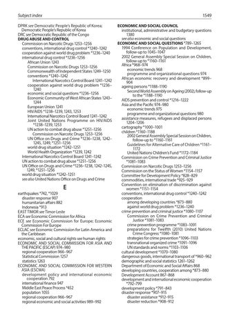 ECONOMIC AND SOCIAL COUNCIL institutional, administrative and budgetary questions 1380 see also economic and social questions ECONOMIC AND SOCIAL QUESTIONS *789–1265 1994 Conference on Population and Development, follow-up to 1045–1047 2002 General Assembly Special Session on Children, follow-up to *1160–1161 Africa *968–974 economic trends 968 programme and organizational questions 974 African economic recovery and development *899– 904 ageing persons *1188–1190 Second World Assembly on Ageing (2002), follow-up to the *1188–1190 AIDS prevention and control *1216–1222 Asia and the Pacific 974–980 economic trends 975 programme and organizational questions 980 assistance measures, refugees and displaced persons 1204–1206 cartography *1000–1001 children *1160–1188 2002 General Assembly Special Session on Children, follow-up to *1160–1161 Guidelines for Alternative Care of Children *1161– 1172 United Nations Children’s Fund *1172–1184 Commission on Crime Prevention and Criminal Justice *1081–1083 Commission on Narcotic Drugs 1253–1256 Commission on the Status of Women *1154–1157 Committee for Development Policy *828–829 commodities, international trade *925–929 Convention on elimination of discrimination against women *1151–1154 conventions, international drug control *1240–1242 cooperation among developing countries *873–880 against world drug problem *1236–1240 crime prevention and criminal justice *1080–1107 Commission on Crime Prevention and Criminal Justice *1081–1083 crime prevention programme *1083–1091 preparations for Twelfth (2010) United Nations Crime Congress *1080–1081 strategies for crime prevention *1096–1103 transnational organized crime *1091–1096 UN standards and norms *1103–1106 cultural development *1070–1080 dangerous goods, international transport of *960–962 demographic and social statistics 1261–1262 Department of Economic and Social Affairs 868 developing countries, cooperation among *873–880 Development Account 867–868 development and international economic cooperation *792–799 development policy *791–843 disaster response *907–915 disaster assistance *912–915 disaster reduction *908–912