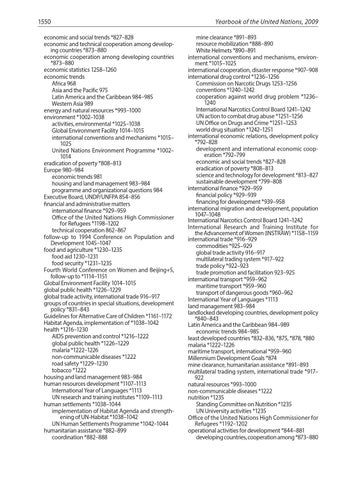 1550 economic and social trends *827–828 economic and technical cooperation among developing countries *873–880 economic cooperation among developing countries *873–880 economic statistics 1258–1260 economic trends Africa 968 Asia and the Pacific 975 Latin America and the Caribbean 984–985 Western Asia 989 energy and natural resources *993–1000 environment *1002–1038 activities, environmental *1025–1038 Global Environment Facility 1014–1015 international conventions and mechanisms *1015– 1025 United Nations Environment Programme *1002– 1014 eradication of poverty *808–813 Europe 980–984 economic trends 981 housing and land management 983–984 programme and organizational questions 984 Executive Board, UNDP/UNFPA 854–856 financial and administrative matters international finance *929–959 Office of the United Nations High Commissioner for Refugees *1198–1202 technical cooperation 862–867 follow-up to 1994 Conference on Population and Development 1045–1047 food and agriculture *1230–1235 food aid 1230–1231 food security *1231–1235 Fourth World Conference on Women and Beijing+5, follow-up to *1114–1151 Global Environment Facility 1014–1015 global public health *1226–1229 global trade activity, international trade 916–917 groups of countries in special situations, development policy *831–843 Guidelines for Alternative Care of Children *1161–1172 Habitat Agenda, implementation of *1038–1042 health *1216–1230 AIDS prevention and control *1216–1222 global public health *1226–1229 malaria *1222–1226 non-communicable diseases *1222 road safety *1229–1230 tobacco *1222 housing and land management 983–984 human resources development *1107–1113 International Year of Languages *1113 UN research and training institutes *1109–1113 human settlements *1038–1044 implementation of Habitat Agenda and strengthening of UN-Habitat *1038–1042 UN Human Settlements Programme *1042–1044 humanitarian assistance *882–899 coordination *882–888