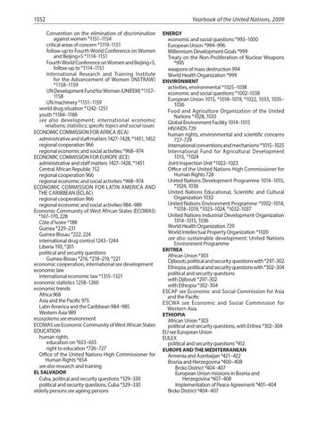 1552 Convention on the elimination of discrimination against women *1151–1154 critical areas of concern *1119–1151 follow-up to Fourth World Conference on Women and Beijing+5 *1114–1151 Fourth World Conference on Women and Beijing+5, follow-up to *1114–1151 International Research and Training Institute for the Advancement of Women (INSTRAW) *1158–1159 UN Development Fund for Women (UNIFEM) *1157– 1158 UN machinery *1151–1159 world drug situation *1242–1251 youth *1184–1188 see also development; international economic relations; statistics; specific topics and social issues ECONOMIC COMMISSION FOR AFRICA (ECA) administrative and staff matters 1427–1428, *1451, 1452 regional cooperation 966 regional economic and social activities *968–974 ECONOMIC COMMISSION FOR EUROPE (ECE) administrative and staff matters 1427–1428, *1451 Central African Republic 152 regional cooperation 966 regional economic and social activities *968–974 ECONOMIC COMMISSION FOR LATIN AMERICA AND THE CARIBBEAN (ECLAC) regional cooperation 966 regional economic and social activities 984–989 Economic Community of West African States (ECOWAS) *167–170, 228 Côte d’Ivoire *188 Guinea *229–231 Guinea-Bissau *222, 224 international drug control 1243–1244 Liberia 193, *201 political and security questions Guinea-Bissau *216, *218–219, *221 economic cooperation, international see development economic law international economic law *1315–1321 economic statistics 1258–1260 economic trends Africa 968 Asia and the Pacific 975 Latin America and the Caribbean 984–985 Western Asia 989 ecosystems see environment ECOWAS see Economic Community of West African States EDUCATION human rights education on *653–655 right to education *726–727 Office of the United Nations High Commissioner for Human Rights *654 see also research and training EL SALVADOR Cuba, political and security questions *329–330 political and security questions, Cuba *329–330 elderly persons see ageing persons