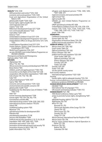 1555 refugees and displaced persons *1196, 1200, 1205, *1207–1208, 1211 regional economic and social activities 974 right to food *722 right to health 730 UNAIDS see Joint United Nations Programme on HIV/AIDS UNDP operational activities 857–858 United Nations Children’s Fund 1174, 1176, 1178–1179 women 1114, *1116, *1121, *1124, *1126–1130, *1143, *1146–1148, *1150–1151, *1154, *1156–1157 youth *1184–1185 HONDURAS Caribbean Community *315 human rights 761–762 Organization of American States *314–318 political and security questions *314–318 HORN OF AFRICA *232–304 African Union 297, *299, *302 Chad–Sudan *268–270 Djibouti and Eritrea *297–302 Eritrea–Ethiopia *302–304 political and security questions *232–304 Chad–Sudan *268–270 Djibouti and Eritrea *297–302 Eritrea–Ethiopia *302–304 Somalia *270–297 Sudan *232–268 Somalia *270–297 Sudan *232–268 see also specific country names host country relations international legal questions *1327–1329 housing human rights, right to adequate housing *723–724 human immunodeficiency virus/acquired immunodeficiency syndrome (HIV/AIDS) see HIV/AIDS HUMAN RESOURCES DEVELOPMENT *1107–1113 HIV/AIDS *1108 International Year of Languages *1113 UN research and training institutes *1109–1113 HUMAN RIGHTS *621–788 1993 World Conference, follow-up to *655 action to promote human rights, strengthening *647– 653 adequate housing, right to *723–724 Afghanistan 762–763 Africa 751–758 Burundi 751–752 Democratic Republic of the Congo 752–754 Liberia 754–755 Sierra Leone 755–756 Somalia 756–757 Sudan 757–758 African Descent, International Year for People of *655 African Union 756–758 African Union-United Nations Hybrid Operation in Darfur 757–758 Americas 758–762 Bolivia 758–759 Colombia 759–760