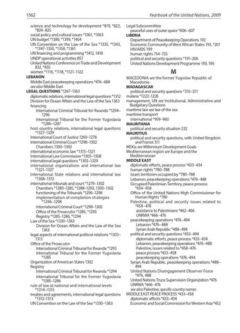 1562 science and technology for development *819, *822, *824–825 social policy and cultural issues *1061, *1063 UN budget *1389, *1399, *1404 UN Convention on the Law of the Sea *1335, *1343, *1347–1350, *1358, *1361 UN financing and programming *1412, 1418 UNDP operational activities 857 United Nations Conference on Trade and Development 832, *835 women *1116, *1118, *1121–1122 LEBANON Middle East peacekeeping operations *476–488 see also Middle East LEGAL QUESTIONS *1267–1363 diplomatic relations, international legal questions *1312 Division for Ocean Affairs and the Law of the Sea 1363 financing International Criminal Tribunal for Rwanda *1294– 1296 International Tribunal for the Former Yugoslavia *1286–1287 host country relations, international legal questions *1327–1329 International Court of Justice 1269–1278 International Criminal Court *1298–1302 Chambers 1300–1302 international economic law *1315–1321 International Law Commission *1303–1308 international legal questions *1303–1329 international organizations and international law *1321–1327 International State relations and international law *1308–1312 international tribunals and court *1279–1302 Chambers *1280–1285, *1288–1293, 1300–1302 functioning of the Tribunals *1296–1298 implementation of completion strategies *1296–1298 International Criminal Court *1298–1302 Office of the Prosecutor *1285, *1293 Registry *1285–1286, *1294 Law of the Sea *1330–1363 Division for Ocean Affairs and the Law of the Sea 1363 legal aspects of international political relations *1303– 1313 Office of the Prosecutor International Criminal Tribunal for Rwanda *1293 International Tribunal for the Former Yugoslavia *1285 Organization of American States 1302 Registry International Criminal Tribunal for Rwanda *1294 International Tribunal for the Former Yugoslavia *1285–1286 rule of law at national and international levels *1314–1315 treaties and agreements, international legal questions *1312–1313 UN Convention on the Law of the Sea *1330–1363