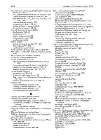 1564 Non-Proliferation of Nuclear Weapons (NPT), Treaty on the *518–520, *525–527 and Comprehensive Nuclear-Test-Ban Treaty *514–516 Democratic People’s Republic of Korea *384–385 disarmament 495, 503, *505–507, *509–511, 529, *531–532, *540 energy and natural resources *995 non-proliferation treaty *519–520 political and security questions 14, 43 UN role in disarmament *501, 502 Non-Self-Governing Territories (NSGTs) decolonization *576–596 human rights 631 support for democracies 573 territories under review *599 see also decolonization NORTH AFRICA political and security questions *304–310 Western Sahara *304–310 see also specific country names North Atlantic Treaty Organization 286, 332, 400, 1274 NPT see Non-Proliferation of Nuclear Weapons, Treaty on the NSGTs see Non-Self-Governing Territories nuclear and radiological terrorism 71 nuclear disarmament *502–518 advisory opinion of International Court of Justice *516–517 Comprehensive Nuclear-Test-Ban Treaty *512–516 prohibition of use of nuclear weapons *517–518 weapons of mass destruction *504, *506, *508 nuclear-weapon-free zones non-proliferation *533–540 Organization of American States *537 Treaty on the Non-Proliferation of Nuclear Weapons *534–538 weapons of mass destruction *536, *538–539 nutrition *1235 economic and social questions *1235 Standing Committee on Nutrition *1235 UN University (UNU) activities *1235 see also food; humanitarian assistance