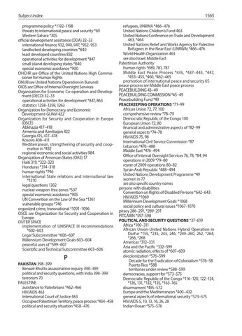 refugees, UNRWA *466–476 United Nations Children’s Fund 463 United Nations Conference on Trade and Development 463, *464 United Nations Relief and Works Agency for Palestine Refugees in the Near East (UNRWA) *466–476 World Health Organization 463 see also Israel; Middle East Palestinian Authority human rights *689, 781, 787 Middle East Peace Process *435, *437–443, *447, *453–455, *460, *462–465 promotion of international peace and security 65 peace process see Middle East peace process PEACEBUILDING 43–49 PEACEBUILDING COMMISSION *45–49 Peacebuilding Fund *49 PEACEKEEPING OPERATIONS *71–99 African Union 72, 77, 100 comprehensive review *78–79 Democratic Republic of the Congo 100 European Union 72, 80 financial and administrative aspects of *82–99 general aspects *74–78 HIV/AIDS 75, 98 International Civil Service Commission *87 Lebanon *476–488 Middle East *476–494 Office of Internal Oversight Services 76, 78, *84, 94 operations in 2009 *79–80 roster of 2009 operations 80–82 Syrian Arab Republic *488–494 United Nations Development Programme *49 women in 77 see also specific country names persons with disabilities Convention on Rights of Disabled Persons *642–643 HIV/AIDS *1069 Millennium Development Goals *1068 social policy and cultural issues *1067–1070 piracy 286–291, *289–291 PITCAIRN *597–598 POLITICAL AND SECURITY QUESTIONS *37–619 Africa *100–311 African Union-United Nations Hybrid Operation in Darfur *155, *235, 243, 246, *249–260, 262, *264, *266, *268 Americas *312–331 Asia and the Pacific *332–399 atomic radiation, effects of *607–609 decolonization *576–599 Decade for the Eradication of Colonialism *576–58 Puerto Rico *588 territories under review *588–599 democracies, support for *573–575 Democratic Republic of the Congo *116–120, 122–124, *126, 131, *132, *135, *163–165 disarmament *495–572 Europe and the Mediterranean *400–432 general aspects of international security *573–575 HIV/AIDS 5, 10, 13, 16, 26, 28 Indian Ocean *575–576