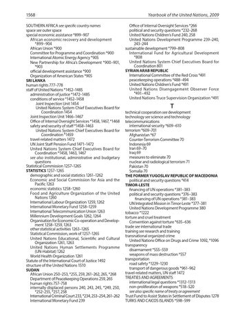 1568 SOUTHERN AFRICA see specific country names space see outer space special economic assistance *899–907 African economic recovery and development *899–904 African Union *900 Committee for Programme and Coordination *900 International Atomic Energy Agency *905 New Partnership for Africa’s Development *900–901, *903 official development assistance *900 Organization of American States *905 SRI LANKA human rights 777–778 staff of United Nations *1452–1485 administration of justice *1472–1485 conditions of service *1452–1458 Joint Inspection Unit 1454 United Nations System Chief Executives Board for Coordination 1454 Joint Inspection Unit 1466–1467 Office of Internal Oversight Services *1458, 1467, *1468 safety and security of staff *1458–1463 United Nations System Chief Executives Board for Coordination *1459 travel-related matters 1472 UN Joint Staff Pension Fund 1471–1472 United Nations System Chief Executives Board for Coordination *1458, 1463, 1467 see also institutional, administrative and budgetary questions Statistical Commission 1257–1265 STATISTICS 1257–1265 demographic and social statistics 1261–1262 Economic and Social Commission for Asia and the Pacific 1263 economic statistics 1258–1260 Food and Agriculture Organization of the United Nations 1260 International Labour Organization 1259, 1262 International Monetary Fund 1258–1259 International Telecommunication Union 1263 Millennium Development Goals 1262, 1264 Organisation for Economic Co-operation and Development 1258–1259, 1263 other statistical activities 1263–1265 Statistical Commission, work of 1257–1265 United Nations Educational, Scientific and Cultural Organization 1261, 1263 United Nations Human Settlements Programme (UN-Habitat) 1262 World Health Organization 1261 Statute of the International Court of Justice 1492 structure of the United Nations 1510 SUDAN African Union 250–253, *255, 259, 261–262, 265, *268 Department of Peacekeeping Operations 259, 265 human rights 757–758 internally displaced persons 240, 243, 245, *249, 250, *252–255, *257, 258 International Criminal Court 233, *234, 253–254, 261–262 International Monetary Fund 239