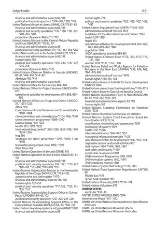 1571 human rights 778 political and security questions *423, *425, *427, *429, *431 United Nations Population Fund (UNFPA) *1048–1055 administrative and staff matters 1472 Guidelines for the Alternative Care of Children *1161 health 1217–1219 Nepal 393 operational activities for development 844, 854–857, 863–866, 869–872, *880 population 1045 UNDP operational activities 859, 861 United Nations Children’s Fund *1172, 1173, 1175, 1179, 1181, 1183 women 1130, *1133, *1157, 1158 United Nations Relief and Works Agency for Palestine Refugees in the Near East (UNRWA) *436, 439, 463, *466–476, 482 administrative and staff matters *1470 human rights *780, 781, 784 United Nations Research Institute for Social Development (UNRISD) 1064 United Nations research and training institutes *1109–1113 United Nations Security Council see Security Council United Nations Stabilization Force in Haiti (MINUSTAH) 80–81, *318–322, *326–329 financial and administrative aspects 83, *88 human rights 761 United Nations Standing Committee on Nutrition (SCN) *1235 United Nations Statistical Commission see statistics United Nations System Chief Executives Board for Coordination (CEB) 12, 16 coordination, monitoring and cooperation 1381 eradication of poverty *809 health 1217, *1226 international finance *945–947, *957 managerial reform and oversight *1425 operational activities for development *847, *851–854 regional economic and social activities 967 staff matters 1454, *1458, 1463, 1467 staff safety and security *1459 sustainable development 801 UN Environment Programme 1005, 1009 UN information systems 1440, *1441 UN institutional matters 1380 United Nations System Staff College *1112–1113 United Nations Truce Supervision Organization (UNTSO) 80 Middle East *476 Syrian Arab Republic *491 United Nations University (UNU) *1110–1111 United Nations Volunteers 873 UNITED STATES and Cuba *330–331 UNITED STATES VIRGIN ISLANDS *599 University for Peace *1111–1112 UNMIK see United Nations Interim Administration Mission in Kosovo UNMIL see United Nations Mission in Liberia UNMIS see United Nations Mission in the Sudan
