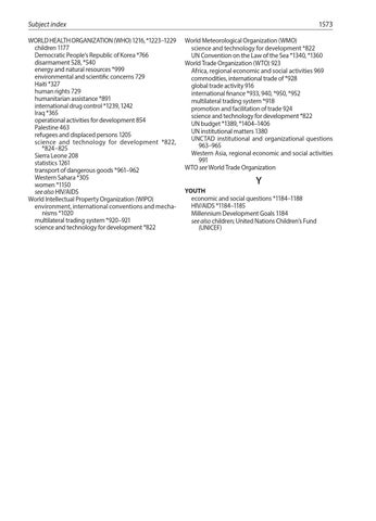 1573 World Meteorological Organization (WMO) science and technology for development *822 UN Convention on the Law of the Sea *1340, *1360 World Trade Organization (WTO) 923 Africa, regional economic and social activities 969 commodities, international trade of *928 global trade activity 916 international finance *933, 940, *950, *952 multilateral trading system *918 promotion and facilitation of trade 924 science and technology for development *822 UN budget *1389, *1404–1406 UN institutional matters 1380 UNCTAD institutional and organizational questions 963–965 Western Asia, regional economic and social activities 991 WTO see World Trade Organization