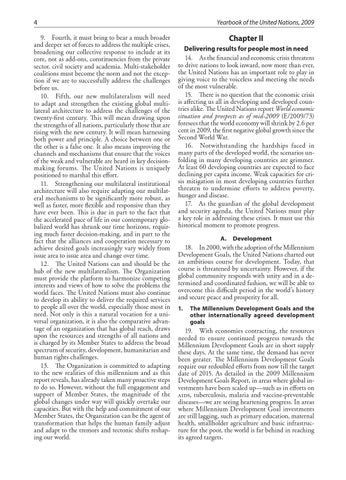 Chapter II Delivering results for people most in need 14. As the financial and economic crisis threatens to drive nations to look inward, now more than ever, the United Nations has an important role to play in giving voice to the voiceless and meeting the needs of the most vulnerable. 15. There is no question that the economic crisis is affecting us all in developing and developed countries alike. The United Nations report World economic situation and prospects as of mid-2009 (E/2009/73) foresees that the world economy will shrink by 2.6 per cent in 2009, the first negative global growth since the Second World War. 16. Notwithstanding the hardships faced in many parts of the developed world, the scenarios unfolding in many developing countries are grimmer. At least 60 developing countries are expected to face declining per capita income. Weak capacities for crisis mitigation in most developing countries further threaten to undermine efforts to address poverty, hunger and disease. 17. As the guardian of the global development and security agenda, the United Nations must play a key role in addressing these crises. It must use this historical moment to promote progress. A. Development 18. In 2000, with the adoption of the Millennium Development Goals, the United Nations charted out an ambitious course for development. Today, that course is threatened by uncertainty. However, if the global community responds with unity and in a determined and coordinated fashion, we will be able to overcome this difficult period in the world’s history and secure peace and prosperity for all. 1. The Millennium Development Goals and the other internationally agreed development goals