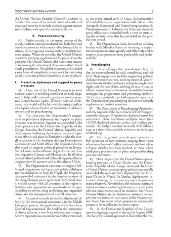 7 as the major armed crisis in Gaza, discontinuation of Israeli-Palestinian negotiations undertaken in the Annapolis framework and limited progress towards Palestinian unity. In Lebanon, the Secretary-General’s good offices were extended with a view to sustaining the relative calm that has prevailed in the postelection period. 45. The Organization looks forward to working further with Member States on investing in capacities to respond to crises quickly and effectively and to support peace processes more predictably and professionally. 2. Peacekeeping