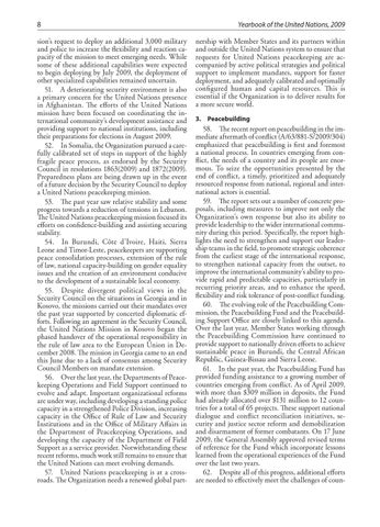 Yearbook of the United Nations, 2009 nership with Member States and its partners within and outside the United Nations system to ensure that requests for United Nations peacekeeping are accompanied by active political strategies and political support to implement mandates, support for faster deployment, and adequately calibrated and optimally configured human and capital resources. This is essential if the Organization is to deliver results for a more secure world. 3. Peacebuilding