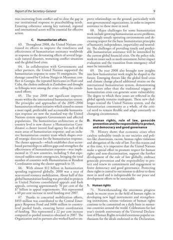 Report of the Secretary-General tries recovering from conflict and to close the gap in our institutional response to peacebuilding needs. Ensuring coherence among key national, regional and international actors will be essential for effective action. C. Humanitarian affairs 63. Throughout 2008, the United Nations continued its efforts to improve the timeliness and effectiveness of humanitarian assistance worldwide in response to the devastating effects of several largescale natural disasters, worsening conflict situations and the global food crisis. 64. In collaboration with Governments and other partners, the United Nations supported the humanitarian response to some 55 emergencies. The damage caused by Cyclone Nargis in Myanmar, conflict in Georgia, the repeated hurricanes in Haiti and Cuba, the cholera outbreak in Zimbabwe and drought in Ethiopia were among the crises calling for coordinated efforts. 65. The year 2008 saw significant improvements within the international humanitarian system. The principles and approaches of the 2005–2006 humanitarian reform initiative which aimed to ensure a more rapid, predictable and accountable humanitarian response are now the standard way the United Nations system supports Governments and affected populations. The humanitarian architecture at the country level is now clearer: a Humanitarian Coordinator; a cluster (sector) lead agency for each of the main areas of humanitarian response; and an inclusive humanitarian country team which shapes overall strategic direction for the humanitarian response. The cluster approach—which establishes clear sectorbased partnerships to address gaps and strengthen the effectiveness of humanitarian response—was implemented in 13 new countries, including 5 that experienced sudden-onset emergencies, bringing the total number of countries with Humanitarian or Resident Coordinators using the cluster approach to 33. 66. With almost $12 billion in humanitarian spending registered globally, 2008 was a year of near-record resource mobilization. About half of this global humanitarian funding was provided to projects in United Nations consolidated appeals and flash appeals, covering approximately 70 per cent of the $7 billion in appeal requirements. This represented a 40 per cent increase in total funding over 2007. 67. Thanks to concerted mobilization efforts, $453 million was contributed to the Central Emergency Response Fund and $406 million to countrylevel pooled funds, ensuring better coordination of funding. This represented a 22 per cent increase compared to pooled resources obtained in 2007. The Organization and its partners also worked hard to im-