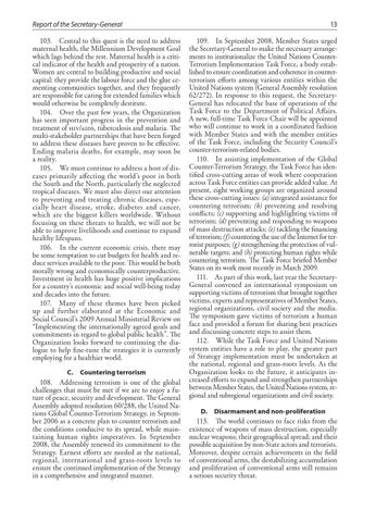 Report of the Secretary-General 103. Central to this quest is the need to address maternal health, the Millennium Development Goal which lags behind the rest. Maternal health is a critical indicator of the health and prosperity of a nation. Women are central to building productive and social capital: they provide the labour force and the glue cementing communities together, and they frequently are responsible for caring for extended families which would otherwise be completely destitute. 104. Over the past few years, the Organization has seen important progress in the prevention and treatment of hiv/aids, tuberculosis and malaria. The multi-stakeholder partnerships that have been forged to address these diseases have proven to be effective. Ending malaria deaths, for example, may soon be a reality. 105. We must continue to address a host of diseases primarily affecting the world’s poor in both the South and the North, particularly the neglected tropical diseases. We must also direct our attention to preventing and treating chronic diseases, especially heart disease, stroke, diabetes and cancer, which are the biggest killers worldwide. Without focusing on these threats to health, we will not be able to improve livelihoods and continue to expand healthy lifespans. 106. In the current economic crisis, there may be some temptation to cut budgets for health and reduce services available to the poor. This would be both morally wrong and economically counterproductive. Investment in health has huge positive implications for a country’s economic and social well-being today and decades into the future. 107. Many of these themes have been picked up and further elaborated at the Economic and Social Council’s 2009 Annual Ministerial Review on “Implementing the internationally agreed goals and commitments in regard to global public health”. The Organization looks forward to continuing the dialogue to help fine-tune the strategies it is currently employing for a healthier world. C. Countering terrorism 108. Addressing terrorism is one of the global challenges that must be met if we are to enjoy a future of peace, security and development. The General Assembly adopted resolution 60/288, the United Nations Global Counter-Terrorism Strategy, in September 2006 as a concrete plan to counter terrorism and the conditions conducive to its spread, while maintaining human rights imperatives. In September 2008, the Assembly renewed its commitment to the Strategy. Earnest efforts are needed at the national, regional, international and grass-roots levels to ensure the continued implementation of the Strategy in a comprehensive and integrated manner.