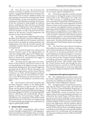 16 135. Over the past year, the Secretariat has worked to facilitate a number of Security Council missions, engaged with Member States to enhance the effectiveness of the Council’s subsidiary bodies and expert groups and assisted in orienting newly elected Council members. As part of an initiative to increase transparency and information exchange, the Secretariat has also continued to make progress on technical matters, including the wider and more user-friendly dissemination of information vital to Member State implementation of the Security Council’s mandatory sanctions measures, as well as the provision of information on the Security Council’s programme and activities to non-Council members. 136. The Organization is following with interest the efforts of the Security Council to collaborate with the General Assembly and the Economic and Social Council and to streamline its working methods. The Organization trusts that the Security Council will consolidate the gains that have been made and keep moving forward. 137. The Secretary-General views reform of the Security Council as part of the ongoing efforts to make this indispensable organ more broadly representative and efficient. He encourages all Member States to maintain the momentum and engage in a fruitful process of negotiation. 138. The Organization appreciates the contribution of the Economic and Social Council to advancing thinking on the global economic crisis and financing for development. The Council’s high-level meeting with the Bretton Woods institutions, the World Trade Organization and the United Nations Conference on Trade and Development produced important inputs for the United Nations Conference on the World Financial and Economic Crisis and its Impact on Development convened in June 2009. 139. The Economic and Social Council has also provided important support to the global health agenda. In addition to a special event on “Philanthropy and the global health agenda”, the Council has encouraged five country-led regional meetings on financing strategies for health care, promoting health literacy, addressing non-communicable diseases, fighting hiv/aids and promoting e-health. These contributed to the preparation of the 2009 Annual Ministerial Review on the theme of “Implementing the internationally agreed goals and commitments in regard to global public health”. 3. System-wide coherence