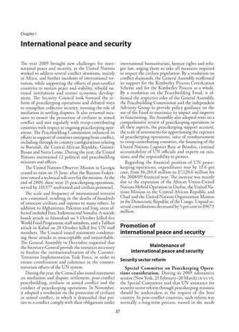International peace and security The year 2009 brought new challenges for international peace and security, as the United Nations worked to address several conflict situations, mainly in Africa, and further incidents of international terrorism, while supporting the efforts of post-conflict countries to sustain peace and stability, rebuild national institutions and restore economic development. The Security Council took forward the reform of peacekeeping operations and debated ways to strengthen collective security, stressing the role of mediation in settling disputes. It also reviewed measures to ensure the protection of civilians in armed conflict and met regularly with troop-contributing countries with respect to ongoing peacekeeping operations. The Peacebuilding Commission enhanced its efforts in support of countries emerging from conflict, including through its country configurations relating to Burundi, the Central African Republic, GuineaBissau and Sierra Leone. During the year, the United Nations maintained 12 political and peacebuilding missions and offices. The United Nations Observer Mission in Georgia ceased to exist on 15 June, after the Russian Federation vetoed a technical roll-over for the mission. At the end of 2009, there were 15 peacekeeping operations, served by 119,577 uniformed and civilian personnel. The scale and frequency of international terrorist acts continued, resulting in the deaths of hundreds of innocent civilians and injuries to many others. In addition to Afghanistan, Pakistan and Iraq, areas affected included Iran, Indonesia and Somalia. A suicide bomb attack in Islamabad on 5 October killed five World Food Programme staff members, and a Taliban attack in Kabul on 28 October killed five UN staff members. The Council issued statements condemning those attacks as unacceptable and unjustifiable. The General Assembly in December requested that the Secretary-General provide the resources necessary to finalize the institutionalization of the CounterTerrorism Implementation Task Force, in order to ensure coordination and coherence in the counterterrorism efforts of the UN system. During the year, the Council also issued statements on mediation and dispute settlement, post-conflict peacebuilding, civilians in armed conflict and the conduct of peacekeeping operations. In November, it adopted a resolution on the protection of civilians in armed conflict, in which it demanded that parties to a conflict comply with their obligations under