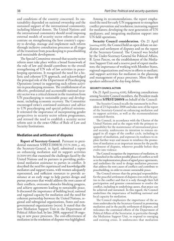 On 21 April [meeting 6108], following consultations among Security Council members, the President made statement S/PRST/2009/8 on behalf of the Council: The Security Council recalls the statement by its President of 23 September 2008 and takes note of the report of the Secretary-General on enhancing mediation and its support activities, as well as the recommendations contained therein. The Council, in accordance with the Charter of the United Nations and as the organ with the primary responsibility for the maintenance of international peace and security, underscores its intention to remain engaged in all stages of the conflict cycle, including in support of mediation, and expresses its readiness to explore further ways and means to reinforce the promotion of mediation as an important means for the pacific settlement of disputes, wherever possible before they evolve into violence. The Council recognizes the importance of mediation, to be launched in the earliest possible phases of conflicts as well as in the implementation phases of signed peace agreements, and underlines the need to design mediation processes that address the root causes of conflicts and contribute to peacebuilding, in order to ensure sustainable peace. The Council stresses that the principal responsibility for the peaceful settlement of disputes rests with the parties to the conflict and that it is only through their full participation and genuine commitment to resolve the conflict, including its underlying causes, that peace can be achieved and sustained. In this regard, the Council underlines the importance of building national and local capacity for mediation. The Council emphasizes the importance of the actions undertaken by the Secretary-General in promoting mediation and in the pacific settlement of disputes, and welcomes the continued efforts of the Department of Political Affairs of the Secretariat, in particular through the Mediation Support Unit, to respond to emerging and existing crises. It underscores that mediation