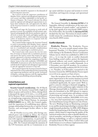 Conflict prevention The General Assembly, by decision 63/563 of 14 September, deferred consideration of the item entitled “Prevention of armed conflict” and included it in the draft agenda of its sixty-fourth (2009) session. On 24 December, the Assembly, by decision 64/549, decided that the item “Prevention of armed conflict” would remain for consideration during its resumed sixty-fourth (2010) session. Conflict diamonds Kimberley Process. The Kimberley Process at its seventh annual session (Swakopmund, Namibia, 2–5 November) continued its work relating to the Kimberley Process Certification Scheme (kpcs), which was established in 2003 [YUN 2003, p. 55] to stop the trade in conflict diamonds from fuelling armed conflict, protect the legitimate diamond industry and ensure implementation of UN resolutions on trade in conflict diamonds. As at 5 November, kpcs had 49 members. In accordance with General Assembly resolution 63/134 [YUN 2008, p. 45], Namibia, on 8 December, transmitted to the Secretary-General the 2009 Kimberley Process report [A/64/559] in its capacity as Chair of kpcs. Since the inception of kpcs, there had been a dramatic improvement in the security situation in several diamond-producing countries to which the Process contributed significantly, the report stated. With regard to concerns relating to diamond smuggling, illicit trade activities and human rights violations in the Marange diamond fields in Zimbabwe, a joint workplan was formulated at the 2009 plenary to improve security at access control points and enhance security of processing and storage areas. In accordance with Security Council resolution 1842(2008) [YUN 2008, p. 194], kpcs had maintained close cooperation with the United Nations Group of Experts on Côte d’Ivoire. The kpcs Working Group on Monitoring continued to use satellite monitoring technology to monitor illicit rough diamonds production. In 2008–2009, Belgium funded the footprinting of the Kimberley Process data project, which aimed at improving the quality of the statistical analysis data in order to quickly identify statistical anomalies, and develop an adequate statistical filtering methodology, as well as a regional analysis of statistical data for West Africa, Central Africa and South America so as to enhance implementation of the Kimberley Process in those regions. [YUN 2000, p. 76],