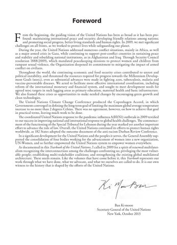 rom the beginning, the guiding vision of the United Nations has been as broad as it has been profound: maintaining international peace and security; developing friendly relations among nations; and promoting social progress, better living standards and human rights. In 2009, we met significant challenges on all fronts, as we worked to protect lives while safeguarding our planet. During the year, the United Nations addressed numerous conflict situations, mainly in Africa, as well as a major armed crisis in Gaza, while continuing to support post-conflict countries in sustaining peace and stability and rebuilding national institutions, as in Afghanistan and Iraq. Through Security Council resolution 1888(2009), which mandated peacekeeping missions to protect women and children from rampant sexual violence, the Organization deepened its commitment to mitigating the impact of armed conflict on civilians. Throughout the world, the continuing economic and food security crises contributed to unrest and political instability, and threatened the resources required for progress towards the Millennium Development Goals (mdg s), even as substantial advances were made in fighting aids, tuberculosis, malaria and vaccine-preventable diseases. We acted to facilitate more effective international coordination, including reform of the international monetary and financial system, and sought to meet development needs for agreed mdg targets in such lagging areas as primary education, maternal health and basic infrastructure. We also framed these crises as opportunities to make needed changes by encouraging green growth and clean technologies. The United Nations Climate Change Conference produced the Copenhagen Accord, in which Governments converged in defining the long-term goal of limiting the maximum global average temperature increase to no more than 2 degrees Celsius. There was no agreement, however, on how to achieve that goal in practical terms, leaving much work to be done. The coordinated United Nations response to the pandemic influenza A(H1N1) outbreak in 2009 testified to our success in improving national and international response to global health challenges. The commencement of the functioning of the Special Tribunal for Lebanon during the year marked yet another important effort to advance the rule of law. Overall, the United Nations continued its efforts to protect human rights worldwide, as 182 States adopted the outcome document of the anti-racism Durban Review Conference. In a significant development for the United Nations and the peoples it serves, the General Assembly supported the consolidation of four bodies working for the advancement of women into a new organization, UN-Women, and so further empowered the United Nations system to empower women everywhere. As documented in this Yearbook of the United Nations, I called in 2009 for a spirit of renewed multilateralism recognizing the interconnections among the challenges confronting us; privileging the most vulnerable people; establishing multi-stakeholder coalitions; and strengthening the existing global multilateral architecture. These needs remain. Like the volumes that have come before it, this Yearbook represents our work through what we have done, what we advocate, and what we ourselves are called to do. It is our own witness to the history that is shaped by the efforts of the United Nations.