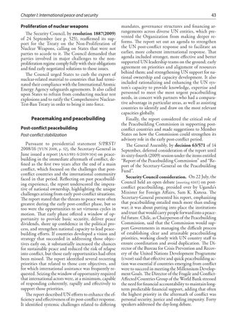 43 mandates, governance structures and financing arrangements across diverse UN entities, which prevented the Organization from making deeper reforms. The report set out an agenda to strengthen the UN post-conflict response and to facilitate an earlier, more coherent international response. That agenda included stronger, more effective and better supported UN leadership teams on the ground; early agreement on priorities and alignment of resources behind them; and strengthening UN support for national ownership and capacity development. It also included rationalizing and enhancing the UN system’s capacity to provide knowledge, expertise and personnel to meet the most urgent peacebuilding needs, in concert with partners who had a comparative advantage in particular areas, as well as assisting countries to identify and draw on the most relevant capacities globally. Finally, the report considered the critical role of the Peacebuilding Commission in supporting postconflict countries and made suggestions to Member States on how the Commission could strengthen its advisory role in the early post-conflict period. The General Assembly, by decision 63/571 of 14 September, deferred consideration of the report until its sixty-fourth (2009) session under the items entitled “Report of the Peacebuilding Commission” and “Report of the Secretary-General on the Peacebuilding Fund”. Security Council consideration. On 22 July, the Council held an open debate [meeting 6165] on postconflict peacebuilding, presided over by Uganda’s Minister for Foreign Affairs, Sam K. Kutesa. The Secretary-General presented his report, emphasizing that peacebuilding entailed much more than ending war; it was about putting into place the institutions and trust that would carry people forward into a peaceful future. Chile, as Chairperson of the Peacebuilding Commission, said that the Commission would support Governments in managing the difficult process of establishing clear and attainable peacebuilding priorities, working closely with UN country staff to ensure coordination and avoid duplication. The Director of the Bureau for Crisis Prevention and Recovery of the United Nations Development Programme (undp) said that effective and quick peacebuilding action was essential if countries emerging from conflict were to succeed in meeting the Millennium Development Goals. The Director of the Fragile and ConflictAffected Countries Group of the World Bank stressed the need for financial accountability to maintain longterm predictable financial support, adding that often the highest priority in the aftermath of conflict was personal security, justice and ending impunity. Forty speakers addressed the day-long debate.