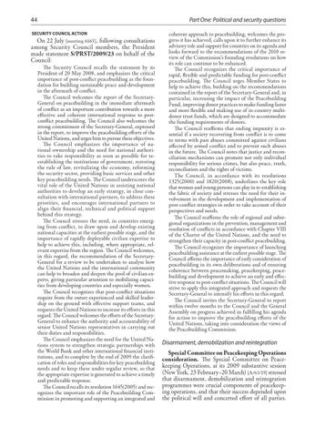 Part One: Political and security questions coherent approach to peacebuilding, welcomes the progress it has achieved, calls upon it to further enhance its advisory role and support for countries on its agenda and looks forward to the recommendations of the 2010 review of the Commission’s founding resolutions on how its role can continue to be enhanced. The Council recognizes the critical importance of rapid, flexible and predictable funding for post-conflict peacebuilding. The Council urges Member States to help to achieve this, building on the recommendations contained in the report of the Secretary-General and, in particular, increasing the impact of the Peacebuilding Fund, improving donor practices to make funding faster and more flexible and making use of in-country multidonor trust funds, which are designed to accommodate the funding requirements of donors. The Council reaffirms that ending impunity is essential if a society recovering from conflict is to come to terms with past abuses committed against civilians affected by armed conflict and to prevent such abuses in the future. The Council notes that justice and reconciliation mechanisms can promote not only individual responsibility for serious crimes, but also peace, truth, reconciliation and the rights of victims. The Council, in accordance with its resolutions 1325(2000) and 1820(2008), underlines the key role that women and young persons can play in re-establishing the fabric of society and stresses the need for their involvement in the development and implementation of post-conflict strategies in order to take account of their perspectives and needs. The Council reaffirms the role of regional and subregional organizations in the prevention, management and resolution of conflicts in accordance with Chapter VIII of the Charter of the United Nations, and the need to strengthen their capacity in post-conflict peacebuilding. The Council recognizes the importance of launching peacebuilding assistance at the earliest possible stage. The Council affirms the importance of early consideration of peacebuilding in its own deliberations and of ensuring coherence between peacemaking, peacekeeping, peacebuilding and development to achieve an early and effective response to post-conflict situations. The Council will strive to apply this integrated approach and requests the Secretary-General to intensify his efforts in this regard. The Council invites the Secretary-General to report within twelve months to the Council and the General Assembly on progress achieved in fulfilling his agenda for action to improve the peacebuilding efforts of the United Nations, taking into consideration the views of the Peacebuilding Commission.