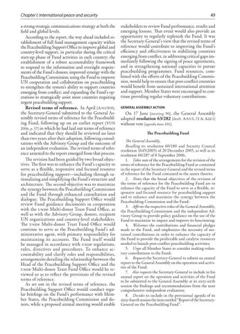 49 stakeholders to review Fund performance, results and emerging lessons. That event would also provide an opportunity to regularly replenish the Fund. It was the Secretary-General’s view that the revised terms of reference would contribute to improving the Fund’s efficiency and effectiveness in stabilizing countries emerging from conflict, in addressing critical gaps immediately following the signing of peace agreements, and in strengthening national capacities to pursue peacebuilding programmes. Fund resources, combined with the efforts of the Peacebuilding Commission, would help to ensure that post-conflict countries would benefit from sustained international attention and support. Member States were encouraged to continue providing regular voluntary contributions. GENERAL ASSEMBLY ACTION