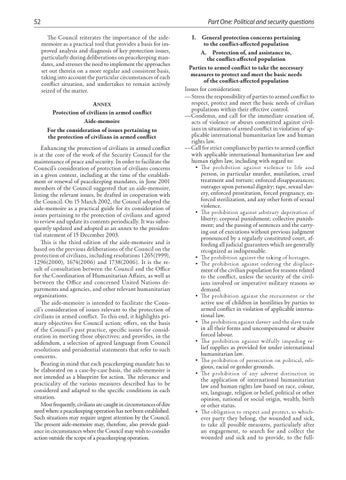 52 The Council reiterates the importance of the aidememoire as a practical tool that provides a basis for improved analysis and diagnosis of key protection issues, particularly during deliberations on peacekeeping mandates, and stresses the need to implement the approaches set out therein on a more regular and consistent basis, taking into account the particular circumstances of each conflict situation, and undertakes to remain actively seized of the matter. A nnex Protection of civilians in armed conflict Aide-memoire For the consideration of issues pertaining to the protection of civilians in armed conflict Enhancing the protection of civilians in armed conflict is at the core of the work of the Security Council for the maintenance of peace and security. In order to facilitate the Council’s consideration of protection of civilians concerns in a given context, including at the time of the establishment or renewal of peacekeeping mandates, in June 2001 members of the Council suggested that an aide-memoire, listing the relevant issues, be drafted in cooperation with the Council. On 15 March 2002, the Council adopted the aide-memoire as a practical guide for its consideration of issues pertaining to the protection of civilians and agreed to review and update its contents periodically. It was subsequently updated and adopted as an annex to the presidential statement of 15 December 2003. This is the third edition of the aide-memoire and is based on the previous deliberations of the Council on the protection of civilians, including resolutions 1265(1999), 1296(2000), 1674(2006) and 1738(2006). It is the result of consultation between the Council and the Office for the Coordination of Humanitarian Affairs, as well as between the Office and concerned United Nations departments and agencies, and other relevant humanitarian organizations. The aide-memoire is intended to facilitate the Council’s consideration of issues relevant to the protection of civilians in armed conflict. To this end, it highlights primary objectives for Council action; offers, on the basis of the Council’s past practice, specific issues for consideration in meeting those objectives; and provides, in the addendum, a selection of agreed language from Council resolutions and presidential statements that refer to such concerns. Bearing in mind that each peacekeeping mandate has to be elaborated on a case-by-case basis, the aide-memoire is not intended as a blueprint for action. The relevance and practicality of the various measures described has to be considered and adapted to the specific conditions in each situation. Most frequently, civilians are caught in circumstances of dire need where a peacekeeping operation has not been established. Such situations may require urgent attention by the Council. The present aide-memoire may, therefore, also provide guidance in circumstances where the Council may wish to consider action outside the scope of a peacekeeping operation.
