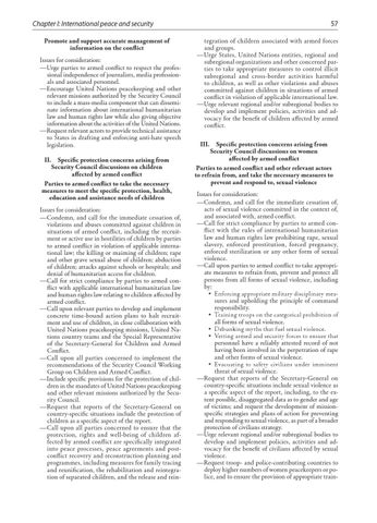 Chapter I: International peace and security Promote and support accurate management of information on the conflict Issues for consideration: —Urge parties to armed conflict to respect the professional independence of journalists, media professionals and associated personnel. —Encourage United Nations peacekeeping and other relevant missions authorized by the Security Council to include a mass-media component that can disseminate information about international humanitarian law and human rights law while also giving objective information about the activities of the United Nations. —Request relevant actors to provide technical assistance to States in drafting and enforcing anti-hate speech legislation. II. Specific protection concerns arising from Security Council discussions on children affected by armed conflict Parties to armed conflict to take the necessary measures to meet the specific protection, health, education and assistance needs of children Issues for consideration: —Condemn, and call for the immediate cessation of, violations and abuses committed against children in situations of armed conflict, including the recruitment or active use in hostilities of children by parties to armed conflict in violation of applicable international law; the killing or maiming of children; rape and other grave sexual abuse of children; abduction of children; attacks against schools or hospitals; and denial of humanitarian access for children. —Call for strict compliance by parties to armed conflict with applicable international humanitarian law and human rights law relating to children affected by armed conflict. —Call upon relevant parties to develop and implement concrete time-bound action plans to halt recruitment and use of children, in close collaboration with United Nations peacekeeping missions, United Nations country teams and the Special Representative of the Secretary-General for Children and Armed Conflict. —Call upon all parties concerned to implement the recommendations of the Security Council Working Group on Children and Armed Conflict. —Include specific provisions for the protection of children in the mandates of United Nations peacekeeping and other relevant missions authorized by the Security Council. —Request that reports of the Secretary-General on country-specific situations include the protection of children as a specific aspect of the report. —Call upon all parties concerned to ensure that the protection, rights and well-being of children affected by armed conflict are specifically integrated into peace processes, peace agreements and postconflict recovery and reconstruction planning and programmes, including measures for family tracing and reunification, the rehabilitation and reintegration of separated children, and the release and rein-