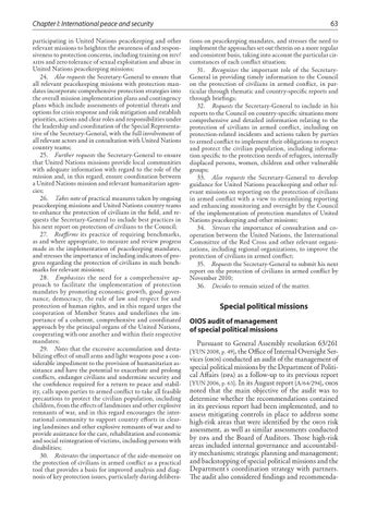 63 tions on peacekeeping mandates, and stresses the need to implement the approaches set out therein on a more regular and consistent basis, taking into account the particular circumstances of each conflict situation; 31. Recognizes the important role of the SecretaryGeneral in providing timely information to the Council on the protection of civilians in armed conflict, in particular through thematic and country-specific reports and through briefings; 32. Requests the Secretary-General to include in his reports to the Council on country-specific situations more comprehensive and detailed information relating to the protection of civilians in armed conflict, including on protection-related incidents and actions taken by parties to armed conflict to implement their obligations to respect and protect the civilian population, including information specific to the protection needs of refugees, internally displaced persons, women, children and other vulnerable groups; 33. Also requests the Secretary-General to develop guidance for United Nations peacekeeping and other relevant missions on reporting on the protection of civilians in armed conflict with a view to streamlining reporting and enhancing monitoring and oversight by the Council of the implementation of protection mandates of United Nations peacekeeping and other missions; 34. Stresses the importance of consultation and cooperation between the United Nations, the International Committee of the Red Cross and other relevant organizations, including regional organizations, to improve the protection of civilians in armed conflict; 35. Requests the Secretary-General to submit his next report on the protection of civilians in armed conflict by November 2010; 36. Decides to remain seized of the matter.