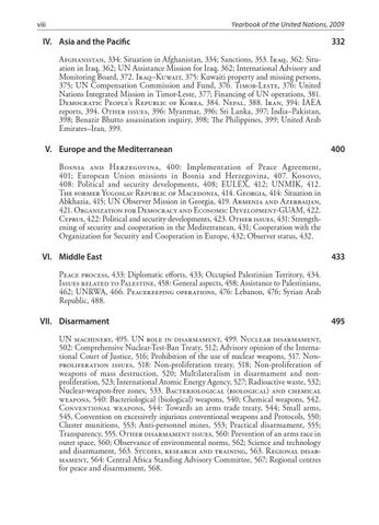 Peace process, 433: Diplomatic efforts, 433; Occupied Palestinian Territory, 434. Issues related to Palestine, 458: General aspects, 458; Assistance to Palestinians, 462; UNRWA, 466. Peacekeeping operations, 476: Lebanon, 476; Syrian Arab Republic, 488.