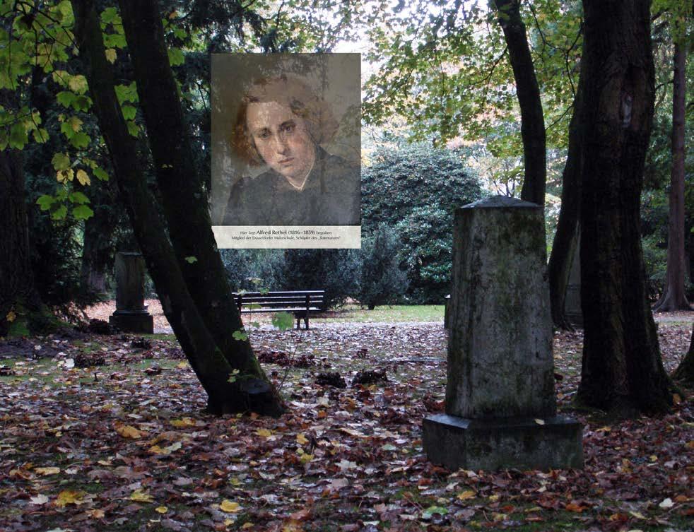Alfred Rethel gehört zu den bedeutendsten Historienmalern der Düsseldorfer Malerschule. In Aachen geboren, besucht der hochbegabte Alfred Rethel schon mit 13 Jahren die Kunstakademie, lernt unter Wilhelm von Schadow und wendet sich bald der Historienmalerei zu. 1836 übersiedelt er nach Frankfurt und erhält dort erste Freskoaufträge für den Frankfurter Römer. 1839 gewinnt er den Wettbewerb um die Ausmalung des Krönungssaales im Aachener Rathaus mit Themen aus dem Leben Karls des Großen. Viele Jahre widmet er sich dieser großen Aufgabe, die mehr und mehr an seiner psychischen Gesundheit zehrt. Große Resonanz finden seine Holzschnitzzyklen „Auch ein Todtentanz“ und „Der Tod als Würger“. 1851 heiratet Rethel Maria Elisabeth Henrietta Philippina Grahl, die bald schwer erkrankt. Zwei Jahre noch verbringt er mit der wieder genesenen Ehefrau und der 1853 geborenen Tochter, dann vertieft sich die Depression und Alfred Rethel wird in eine Nervenheilanstalt in Endenich eingewiesen. Die letzten sechs Jahre seines Lebens verbringt er in der liebevollen Obhut von Mutter und Geschwistern in der Duisburger Straße in Düsseldorf, wo er im Alter von 43 Jahren stirbt. Sein Grab befindet sich auf dem südlichen Teil des alten Golzheimer Friedhofs, neben dem seiner Mutter Johanna.