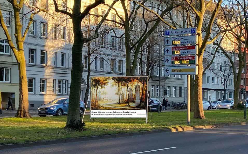 Geplante Aktion von „Unsere Straßen – unsere Künstler“ auf der Fischerstraße: Ein 18/1 Plakat soll auf den – durch den Bürobau von der Straße aus nicht mehr sichtbaren – Friedhof aufmerksam machen. Das Bild ist von Caspar Scheuren, 1830, Stadtmuseum Düsseldorf.