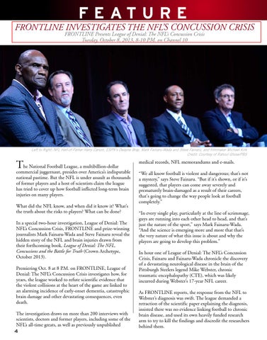 commercial juggernaut, presides over America’s indisputable national pastime. But the NFL is under assault as thousands of former players and a host of scientists claim the league has tried to cover up how football inflicted long-term brain injuries on many players. What did the NFL know, and when did it know it? What’s the truth about the risks to players? What can be done? In a special two-hour investigation, League of Denial: The NFL’s Concussion Crisis, FRONTLINE and prize-winning journalists Mark Fainaru-Wada and Steve Fainaru reveal the hidden story of the NFL and brain injuries drawn from their forthcoming book, League of Denial: The NFL, Concussions and the Battle for Truth (Crown Archetype, October 2013). Premiering Oct. 8 at 8 P.M. on FRONTLINE, League of Denial: The NFL’s Concussion Crisis investigates how, for years, the league worked to refute scientific evidence that the violent collisions at the heart of the game are linked to an alarming incidence of early-onset dementia, catastrophic brain damage and other devastating consequences, even death. The investigation draws on more than 200 interviews with scientists, doctors and former players, including some of the NFL’s all-time greats, as well as previously unpublished 4