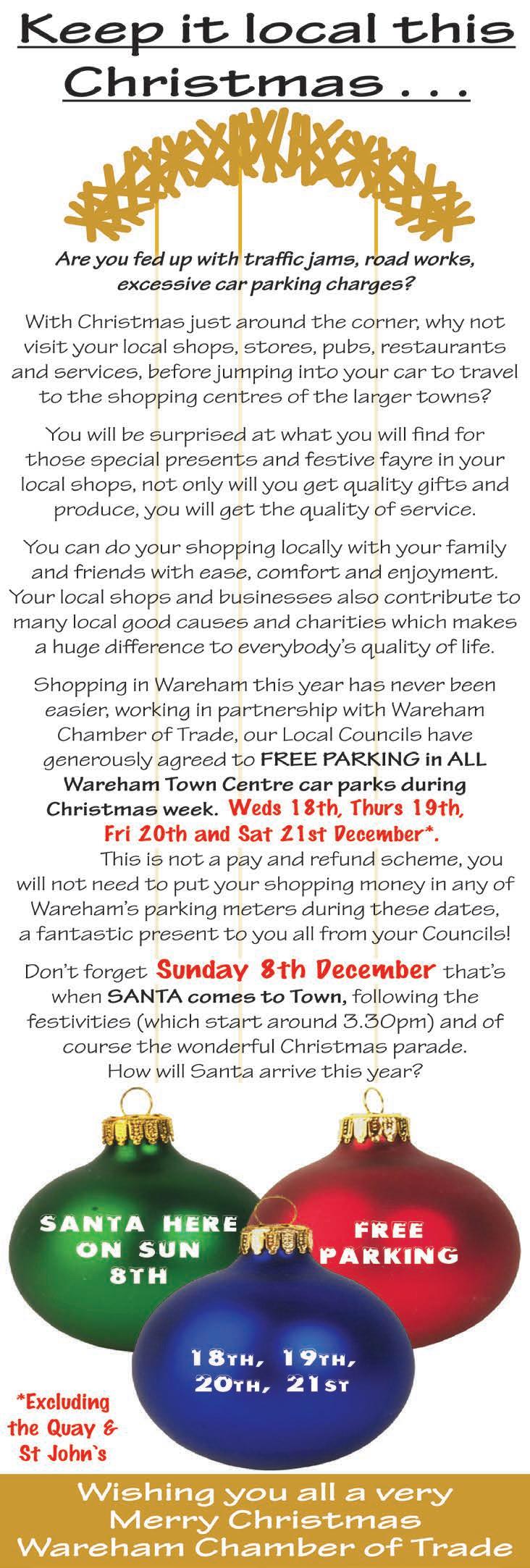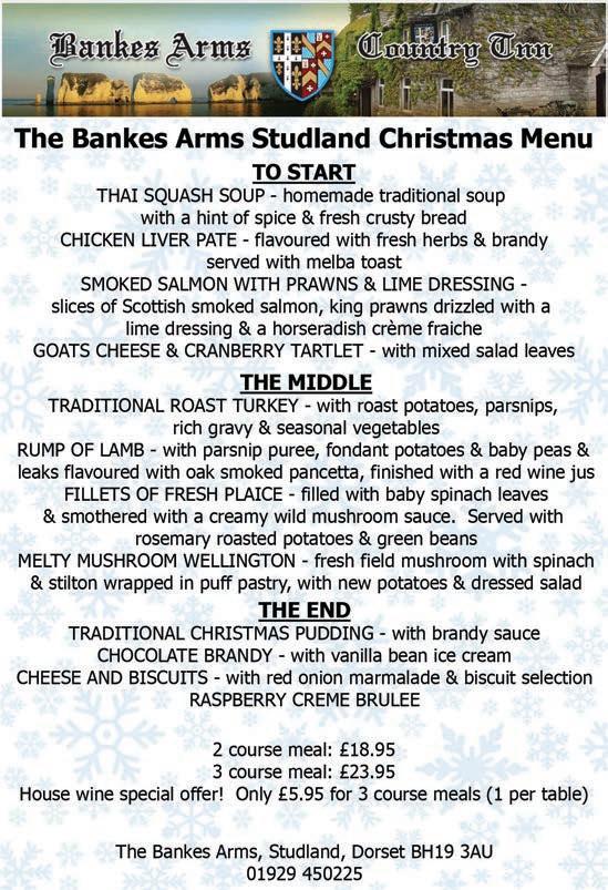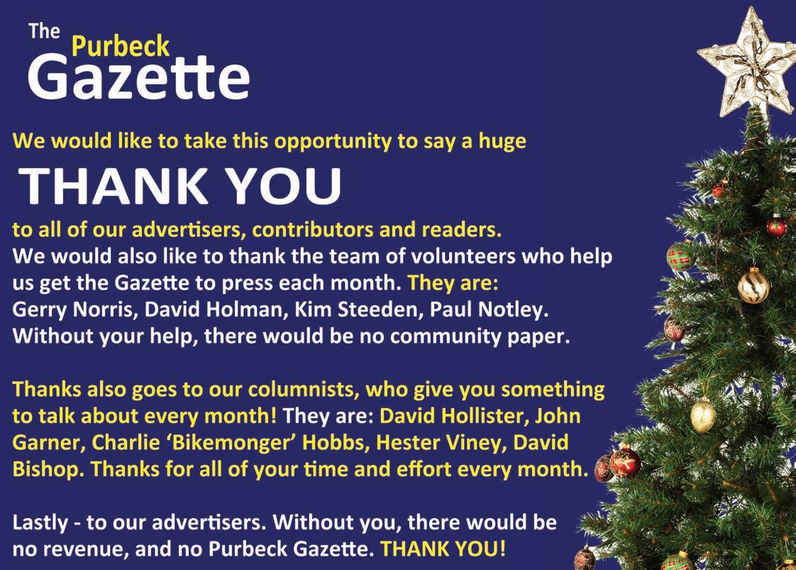 Here we are, yet again at the end of another jam-packed year. I’m proud to state that much of Purbeck stands as it was at the turn of 2012 - we are still managing to keep our local retailers in businesses, and the boarded-up shops that are plaguing other towns have not, as yet, spread to Purbeck. This is down to everyone who shops locally, so please continue to support our local retailers and service providers. This issue sees the culmination of our Purbeck Christmas Challenge. Within this month’s Gazette you’ll find the second half of the challenge, where local businesses advertise to encourage you to complete all of your Christmas shopping in Purbeck this year. Give it a go - you’ll be surprised at the bargains available locally, the internet price-matching, and the wide range of goods available! Everytime you step into a local shop and purchase something, you’re bolstering our local economy, making Purbeck stronger. As always, please wrap-up against the cold, keep an eye on the heating bill and try and block out as many drafts at home as you can. If you’re elderly and alone, call the Purbeck Good Neighbours if you need a hand with a one-off task, don’t suffer in silence!