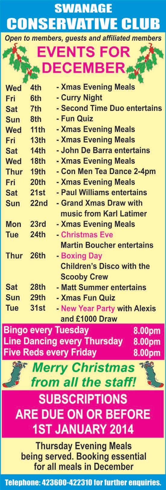 December 2013 Issue no. 167 Swanage Associated SaT Taxis Station Approach, Swanage. BH19 1HB 421122 or 425350 Telephone (01929) Swanage Post Office, Kings Road, SWANAGE. BH19 1ER 01929 422 461 SWANAGE POST OFFICE Great range ofChristmas Cards & Gifts at Hallmark! Happy Christmas and a prosperous NewYear to all of our customers!