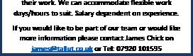 Hours are Monday to Friday 9am – 5.30pm. Salary is dependent on experience.