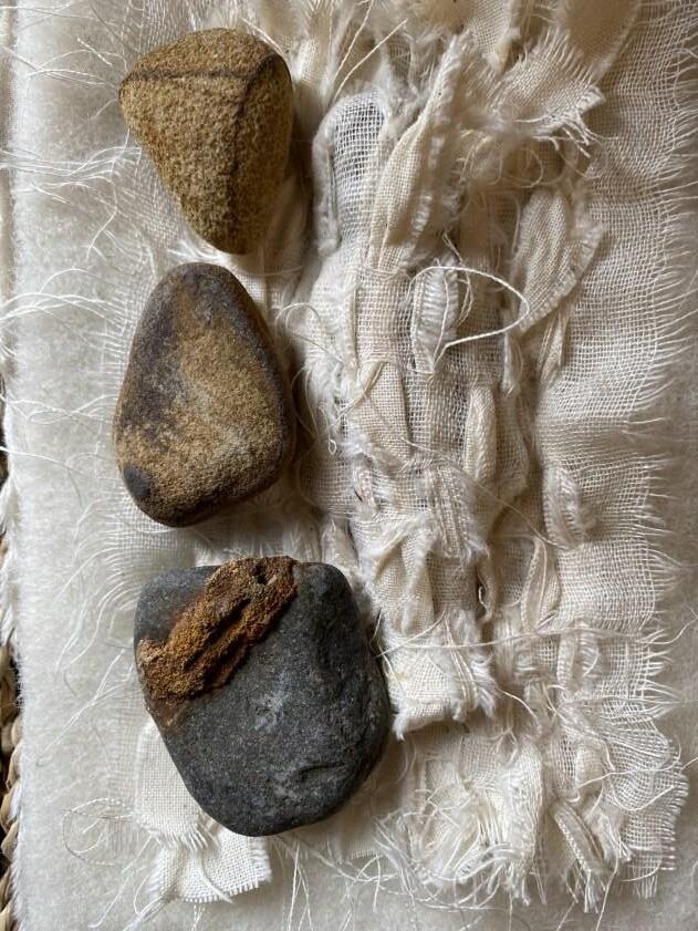 I trapped some wool roving and felt balls within 2 layers of muslin, and then stitched them down onto a piece of calico, using the ubiquitous running stitch. I quite liked the gnarled textures I was making, until I thought of varicose veins! As soon as I’d seen that, I couldn't just leave it as it was, so I added some black seed stitches to emphasize the raised areas. The flat pebble in the photo is one which I had wrapped in calico, and it is just sitting on the surface.
