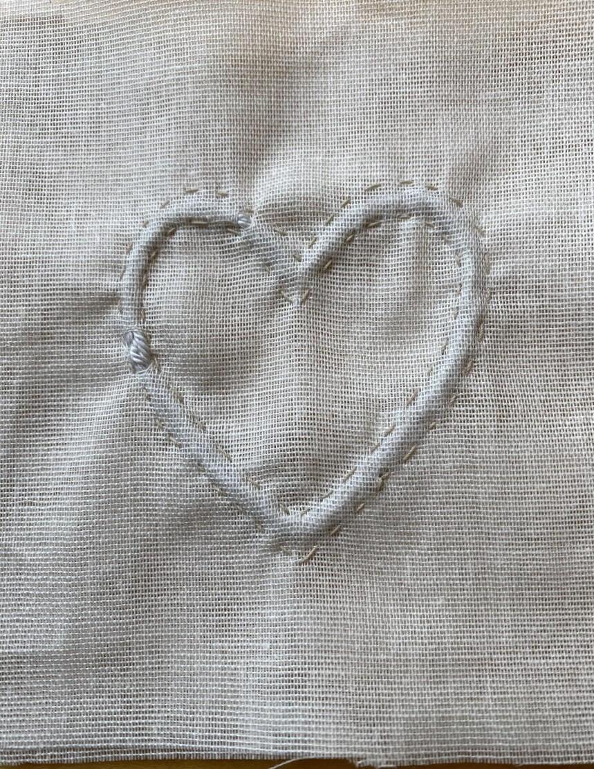Stitch through both layers using a small running stitch. Then make another line of stitching to form a channel . On the wrong side, carefully, using a blunt needle, pass a thick cotton yarn into the channel, being careful to remain between the layers of fabric.