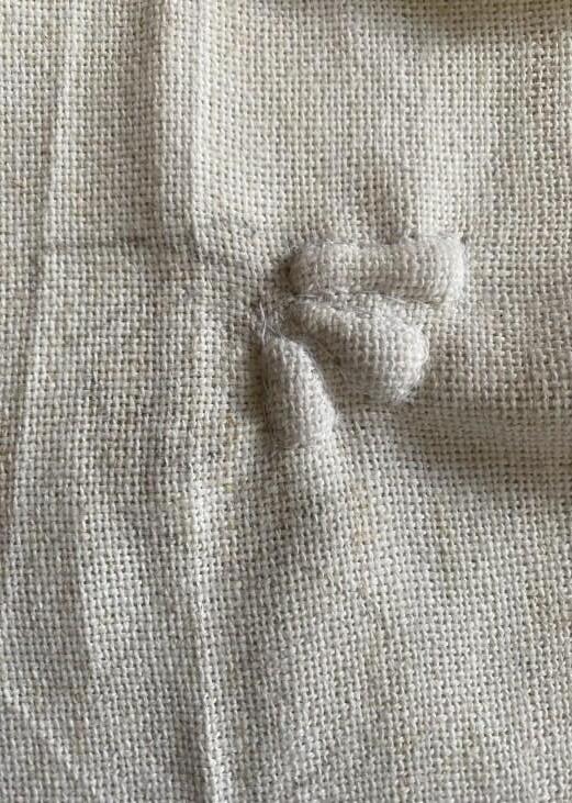 Stitch through both layers using a small running stitch. On the wrong side, carefully, using a blunt needle, wiggle a small hole in the back of one layer of fabric, being careful not to break any of the weft or warp threads.
