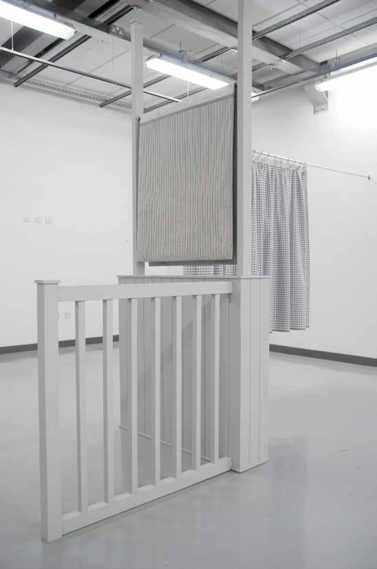 Drawing on Briony Fer’s analysis of the paradoxical subjective encounter evoked through the installational tableau, my intention for the exhibition is to establish a correspondence between more rigid structural frameworks and movable curtains that offer a variety of perspectival positions and a series of continually fluctuating frames. Staged within these structural frameworks are smaller elements that ambiguously reference the history of Salts Mill and textile production as well as the wider everyday functional and social conventions of textile through which we physically and psychologically negotiate our relationship with the world.