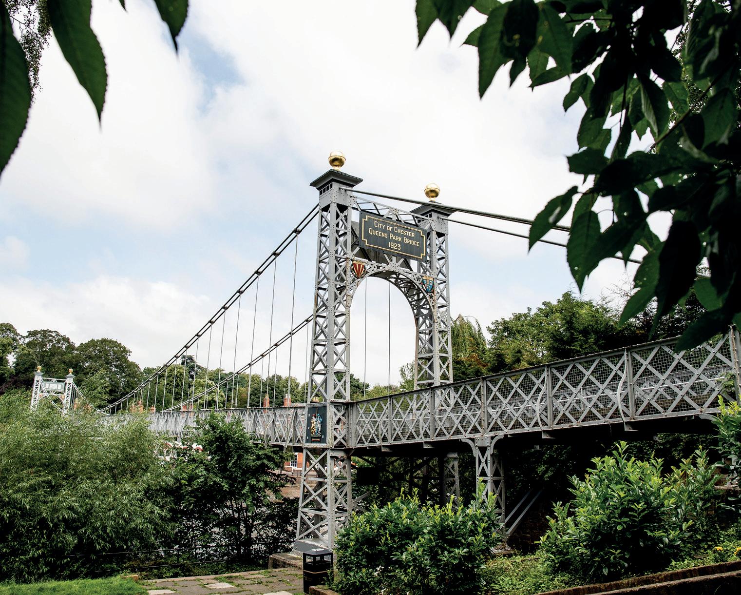 Upon reaching the Old Dee Bridge, turn left and follow the river to Queen’s Park suspension bridge.