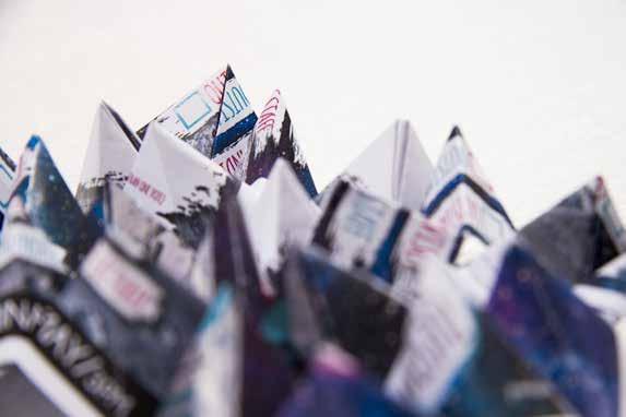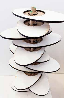 from the previous. Thus creating a form of involvement for the viewer, as they have to physically move with the piece’s different heights and scales to appreciate all elements. While focusing on geometric and angular shapes that create a sense of movement and fluidity, the structure defies gravity as it preciously balances, yet looking menacing and trap like with its sinister, sharp and jagged edges contrasted in layers.