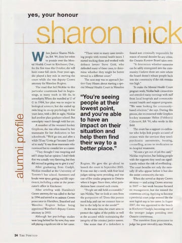 "You're seeing people at their lowest point, and you're able to have an impact on their situation and help them find their way to a better place." Region. He gave the go-a head to laun ch th e co urt in September 2005. It runs one day a week, with four local judges taki ng turns presiding, and was one of five similar programs in Ontario when it began. Since then, other jurisdictions have created such co urts. "People are still held accou ntable," says N icklas, "but we look at cases from the perspective of: ' Does this person need help, and can we connect him or her to the help he or she needs?"' At the same time, the co urt aims to protect the rights of the public as well as th e accused while maintaining th e integrity of the crinunal justice system. Sh e notes th at if a defendant is