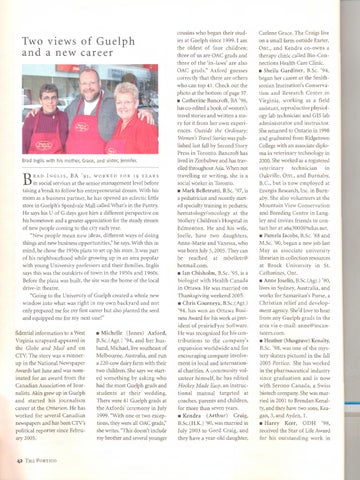 cousins who began their studies at Guelph since 1999. I am the oldest of four children; three of us are OAC grads and three of the 'in-laws' are also OAC grads." Axford guesses correctly that there are others who can top 41. Check out the photo at the bottom of page 37. • Catherine Bancroft, BA '96, has co-edited a book of women's travel stories and written a story for it from her own experiences. 011tside the Ordinary: Women's Travel Stories was published last fall by Second Story Press in Toronto. Bancroft has lived in Zimbabwe and has travelled throughout Asia. When not travelling or writing, she is a social worker in Toronto. • Mark BeJJetrutti, B.Sc. '97, is a pediatrician and recently started specialty training in pediatric hematology/oncology at the Stollery Children's Hospital in Edmonton. He and his wife, Joelle, have two daughters, Anne-Marie and Vanessa, who was born July 5, 2005. They can be reached at mbeJJetr@ hotmail.com. • Ian Chisholm, B.Sc. '95, is a biologist with Health Canada in Ottawa. He was married on Thanksgiving weekend 2005. • Chris Courneya, B.Sc.(Agr.) '94, has won an Ottawa Business Award for his work as president of prairie Pyre Software. He was recognized for his contributions to the company's expansion worldwide and for encouraging company involvement in local and international charities. A community volunteer himself, he has edited Hockey Made Easy, an instructional manual targeted at coaches, parents and chi ldren, for more than seven years. • Kendra (Arthur) Craig, B.Sc.(H.K.) '90, was married in July 2003 to Gord Craig, and they have a year-old daughter,