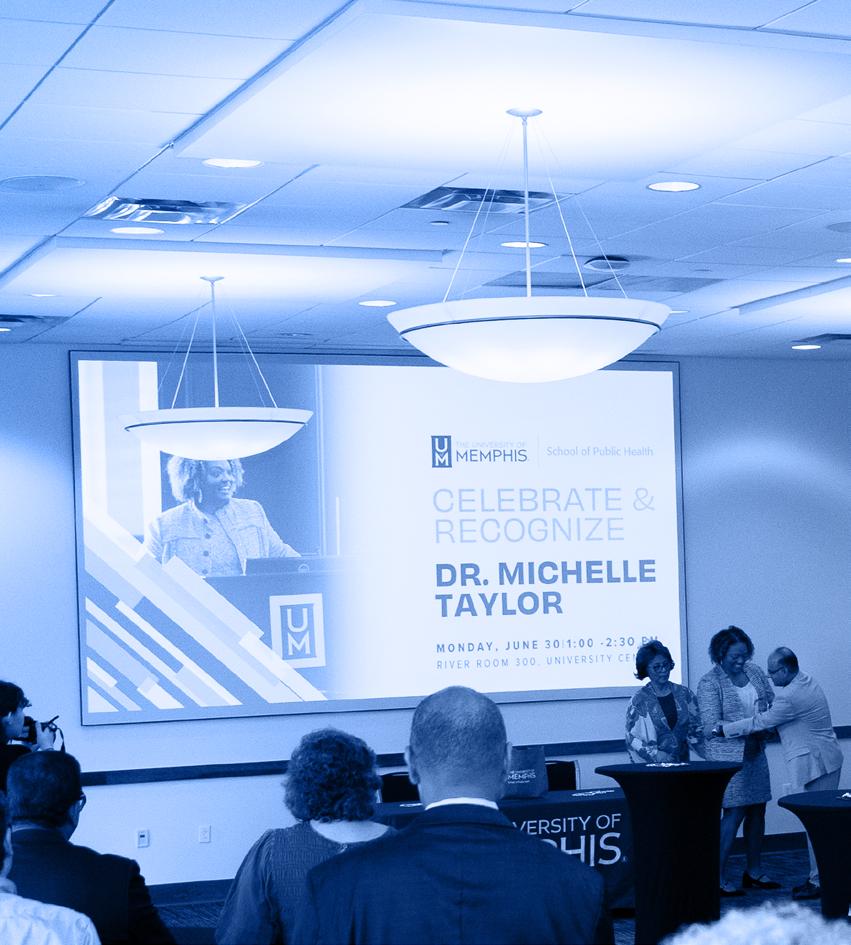 The University of Memphis School of Public Health hosted a celebratory recognition event to highlight the impact Dr. Michelle Taylor (right) — the Shelby County Health Department Director — has had on the SPH Community, Shelby County and the city of Memphis as a whole.