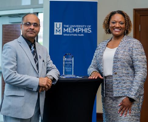 Dean Ashish Joshi (left) presented Dr. Michelle Taylor with the inaugural SPH CARES Champion Award for her “tireless commitment and dedication towards improving public health and advancing the mission and vision of the University of Memphis School of Public Health”.