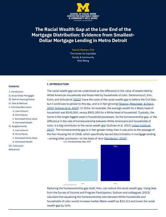 In our most recent white paper, "Does Small-Dollar Lending Help Close the Racial Wealth Gap in Metro Detroit?", delves into the impact of small-dollar lending on homeownership disparities. Examining data from the Home Mortgage Disclosure Act on 2,236 smallest-dollar loans in Metro Detroit from 2018 to 2021, we reveal that lending at the low end of the mortgage distribution perpetuates the racial wealth gap. Black borrowers experience higher leverage, reduced purchasing power, and limited wealthbuilding potential through homeownership compared to their White counterparts.