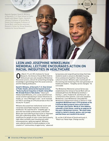 by business and nonprofit partnerships that help residents build or preserve affordable housing, thrive and become healthier. Dismantling the culture of racism, Williams said, must be part of the training and mentoring of the next generation of healthcare leaders. “Empathy can be changed,” he concluded. The Winkelman Memorial Lecture Series was established at the School of Social Work with an endowed gift from the Winkelman brothers— Stanley J., John, Frederick R. and Henry R.—as a memorial to their parents, Leon and Josephine Winkelman. Leon Winkelman cofounded the Winkelman’s department stores in Detroit in 1928. Josephine Winkelman was a 1919 graduate of the U-M Social Work program and a social worker at Chicago’s Hull House. Words of Jane Addams, cofounder of Hull House, could be an epigram for this year’s Winkelman Lecture: “We stand today united in a belief in beauty, genius, and courage, and that these can transform the world.” Or, as the U-M School of Social work puts it, “Reach out. Raise hope. Change society.”