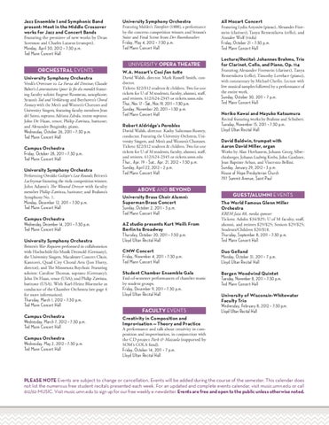 PLEASE NOTE Events are subject to change or cancellation. Events will be added during the course of the semester. This calendar does not list the numerous free student recitals presented each week. For an updated and complete events calendar, visit music.umn.edu or call 612/62-MUSIC. Visit music.umn.edu to sign up for our free weekly e-newsletter. Events are free and open to the public unless otherwise noted.