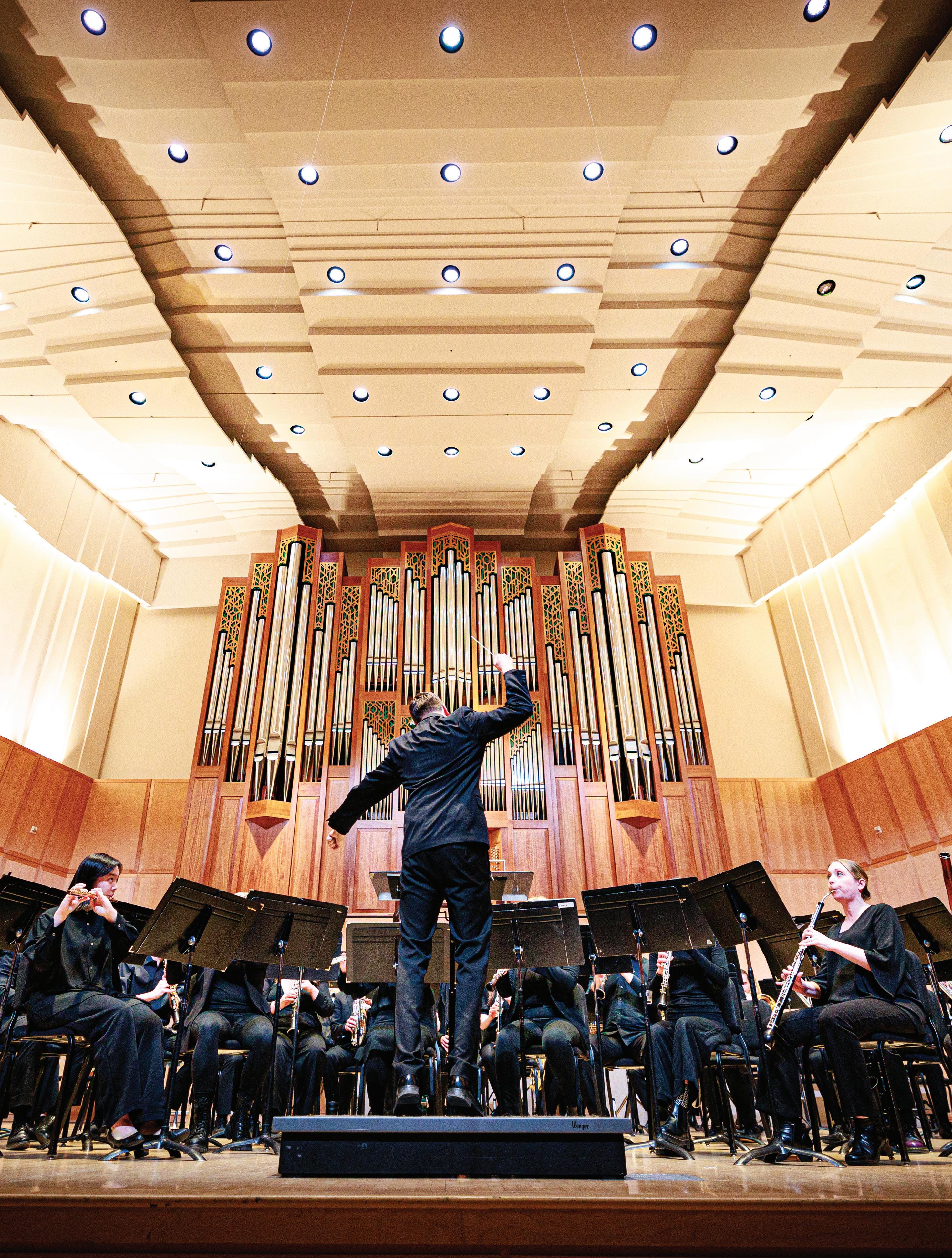 School of Music Director of Bands Jason Missal conducts the wind ensemble for “Arturo Marquez’s Danzon No. 2,” February 2024 on the stage of Libby Gardner Concert Hall in the iconic David Gardner Hall on Presidents Circle. The School of Music offers hundreds of concerts with everything from classics to contemporary music, many of which are free and open to the public. music.utah.edu